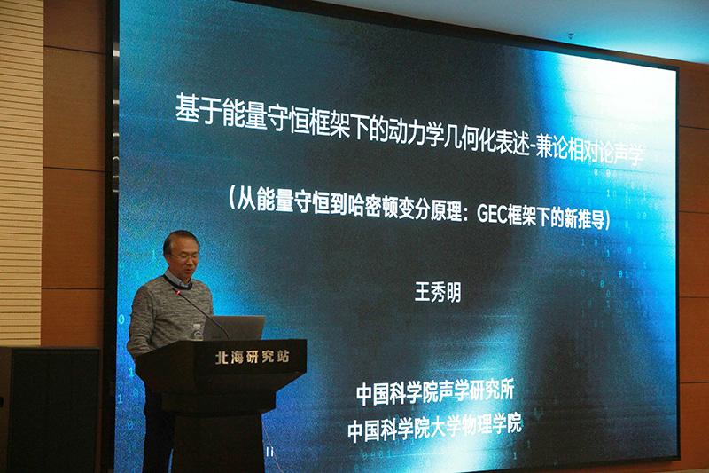 王秀明研究员作题为《基于能量守恒框架下的动力学几何化表述-兼论相对论声学》的报告。报告从几何协变形式表述的普适能量守恒定律出发,推导出标准的测地线方程或动力学方程;通过引入共形变换的雅可比度量,将能量守恒本身重新表述为“自由粒子”的测地线运动,从而在守恒律和几何动力学之间建立了联系;报告还初步讨论了该动力学方程向相对论及相对论声学推广的可能性,试图在理论物理与应用物理的不同领域间建立一些有启发性的联系。